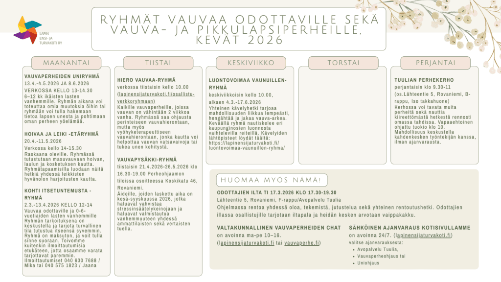 - Vauva- ja pikkulapsiperheiden avopalvelu, numerosta 040 688 5693 (tiistaisin ja torstaisin kello 13-14 )